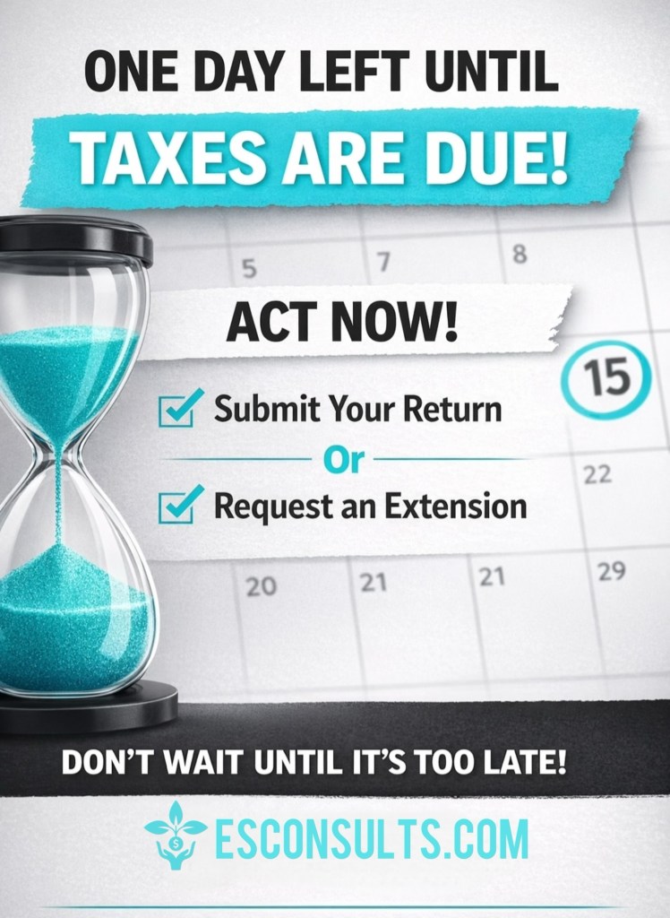 The tax deadline is here…there’s only one day left to take action. Whether you’ve been putting it off or simply got caught up in a busy schedule, it’s crucial to act now to avoid unnecessary penalties and stress.